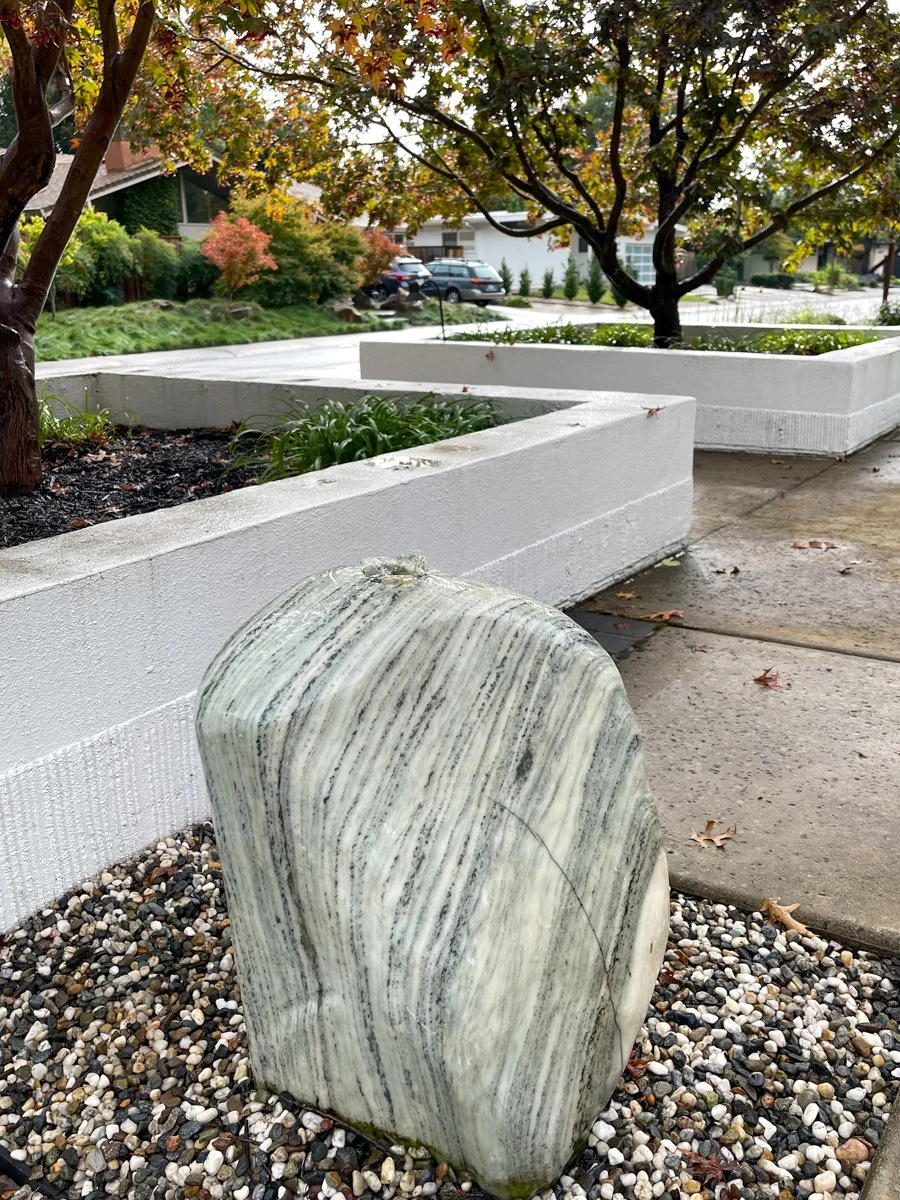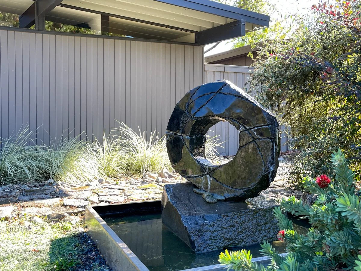 We have noticed that many Streng and Eichler home owners have effectively used the front windowless walls and narrow walkways almost as gallery walls to add some interest and texture to the front of these homes. Others have added a water feature as part of their landscaping which has the added benefit of blocking out street noise.
