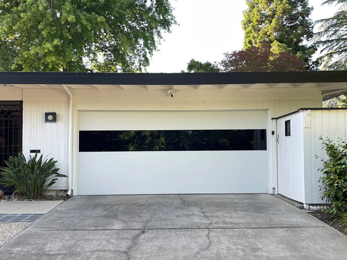 A Space Age looking garage door on a flat top Streng Bros home. The black strip is a window.