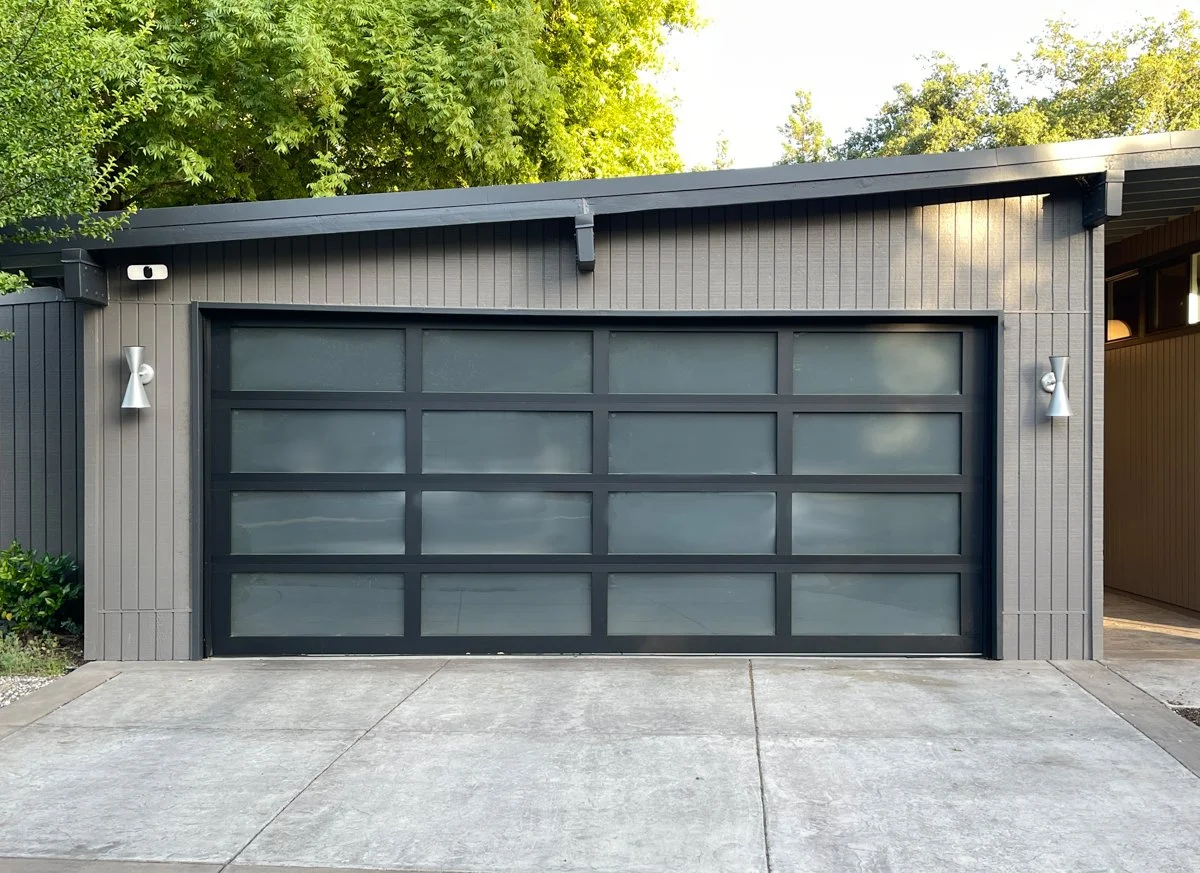 We selected a black Avante aluminum door with etched glass from Clopay. This door has a very modern look and we love how the door allows the natural light into the garage. These doors come in a range of transparencies.
