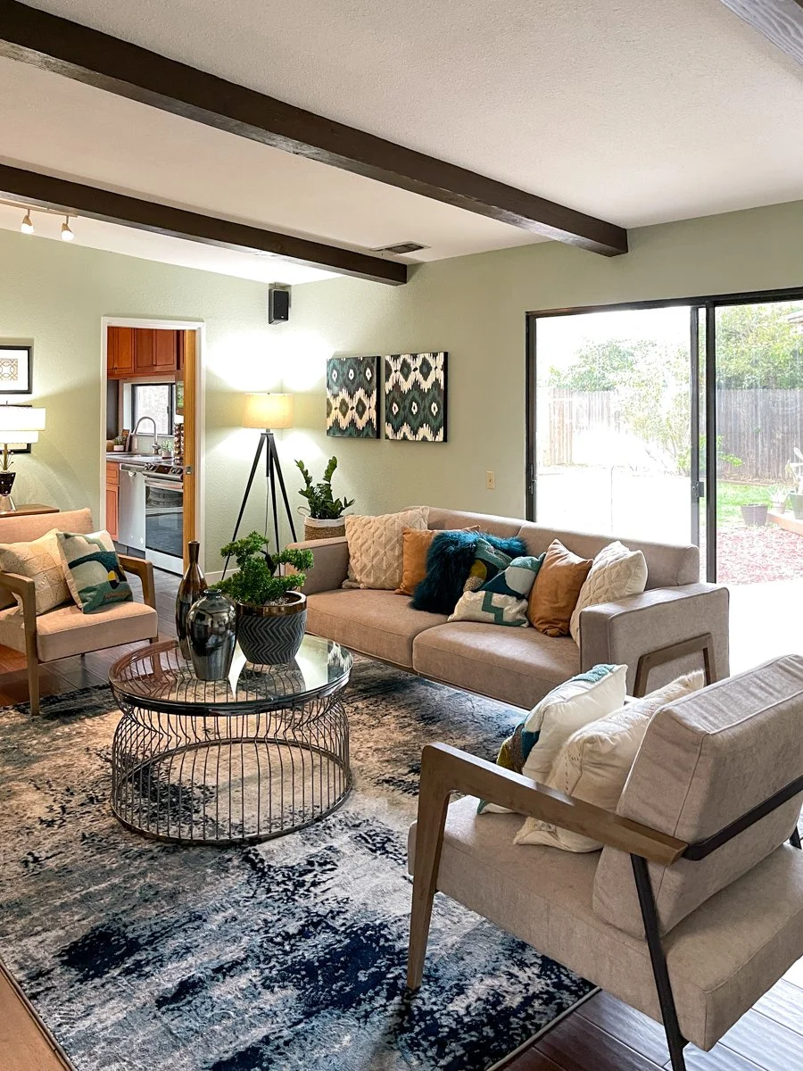 Similarities include flat or low-pitch roofs with no attic space, post and beam construction, slab foundations, clerestory windows and the recognizable mid century modern vibe with open beam ceilings, large great rooms which include kitchen, dining and family areas. Homes typically had an indoor-meets-outdoor feel with large sliding doors opening up the home to the back or side outdoor areas.