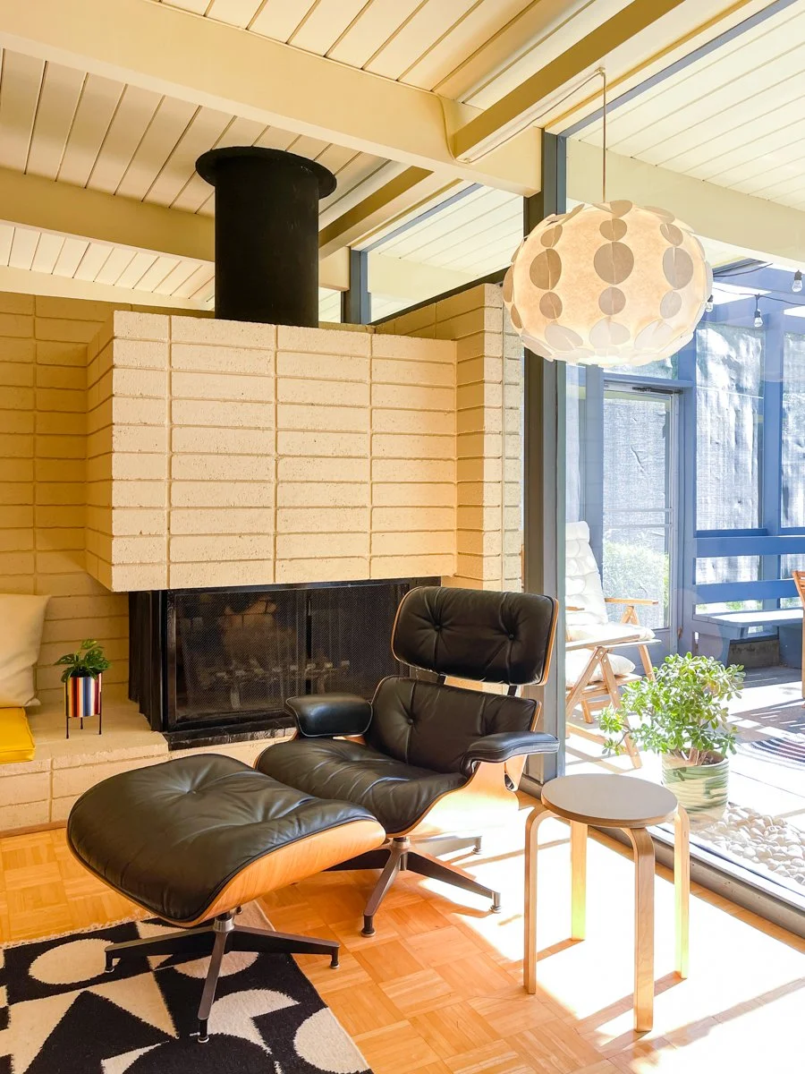 Eichler with fireplace and large sliding door. Wood plank ceilings and beams are painted the same color.